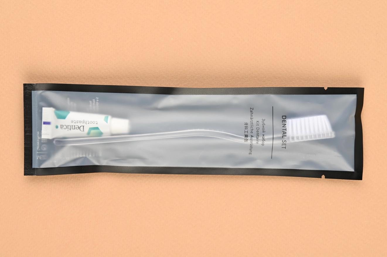 Зубной набор из коллекции Noir состоит из одноразовой зубной щетки длиной 18 см средней жесткости и зубной пасты в миниатюрном тюбике 4 гр.